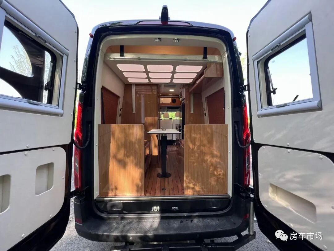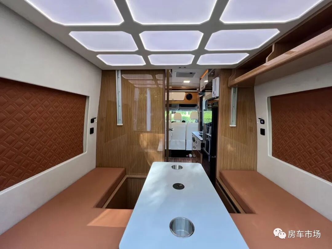 尾部的“U型”卡座区能在驻车时实现拼床,沙发结合升降餐桌,能就餐办公。上部是一张升降吊床可增加休息人数,吊床下部安装有九宫格照明灯。水电方面,配有12V-800ah锂电池(10度电)、以及3000W逆变器、清水箱是150L、灰水箱是50L。该车布局新颖在休息模式下能睡3-4人,丰富的水电储备适合全家出行。