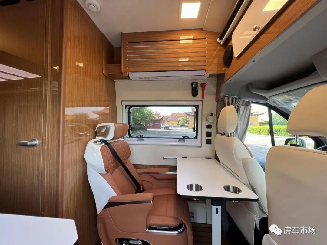 车内座椅采用3+1布局,整车荷载4人。驾驶舱配有多功能方向盘、液晶触控大屏,带有倒车影像+倒车雷达以及定速巡航系统,esp9.3车身稳定系统、胎压监测、正驾驶安全气囊等。驾驶舱后部是该车的会客区,车友选配了一张高端航空座椅带有电动按摩加热、通风等功能,前部是一张移动餐桌,值得注意的是,在使用航空座椅某些功能时需要将餐桌移开。