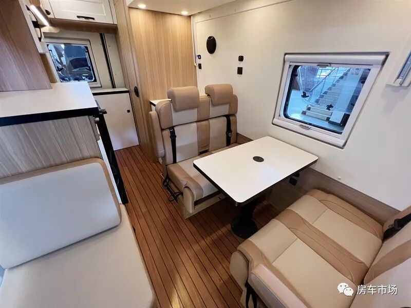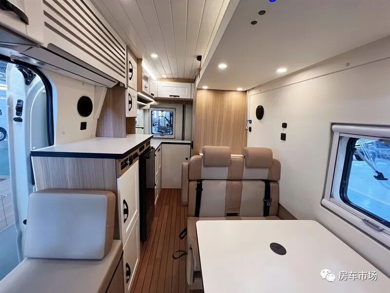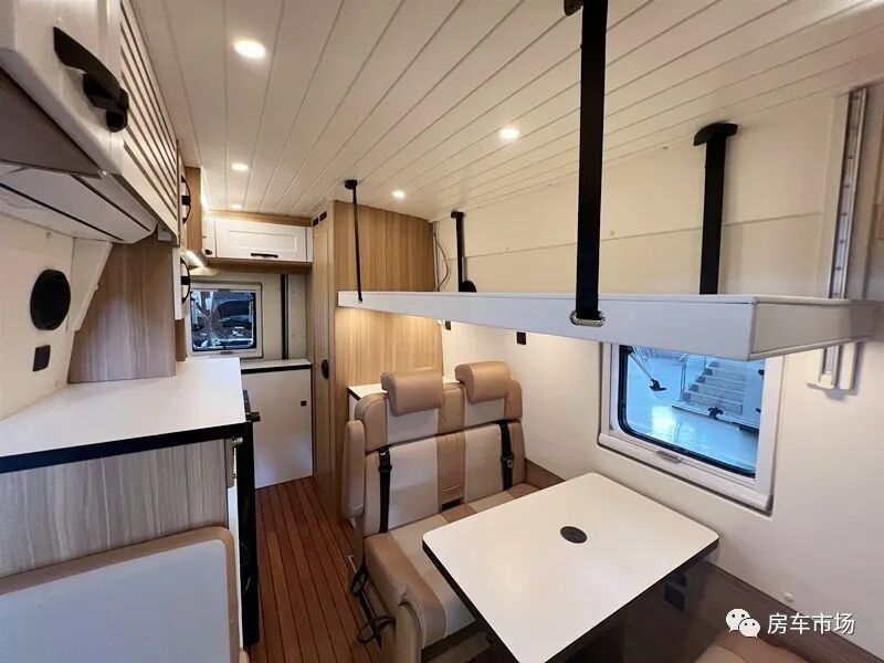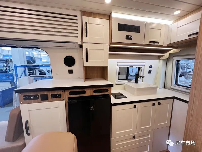 会客区配有对坐沙发,中间是一张升降餐桌,降下餐桌能组合拼床,同时在卡座沙发的上部还配有一张电动升降吊床,驻车时可睡下2人。得益于该车并未设计固定床位,所以前部的客厅以及后部的厨卫也更加宽敞。后部区域打造有多功能厨房组合柜,配有12V-108L车载冰箱、电磁炉、陶瓷水池+水龙头以及非常丰富的储物柜。上部还配了后行车空调出风口以及一台1.5P家用变频空调。
