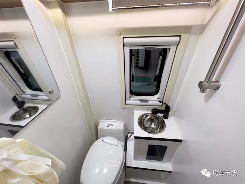 车内打造有独立式卫生间,配有进口盒式马桶、面盆、抽拉式淋浴水龙头、化妆镜、外推窗、毛巾架以及换气扇。在水电储备方面,这款定制版房车配有12V-3000W逆变器、12V-800ah锂电池、150L净水箱以及50L灰水箱。同时该车还配有进口燃油热水恒温暖风系统。