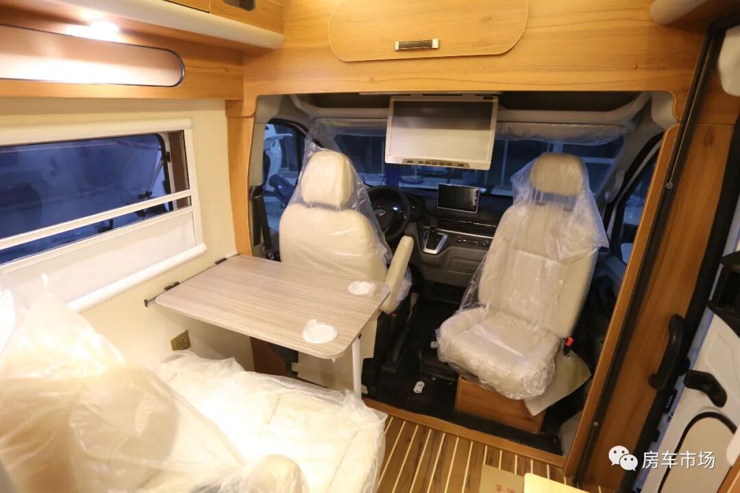 副驾驶座椅可旋转,乘客区座椅采用真皮奔驰威霆座椅,相较于传统的沙发座椅驾乘更舒适更安全,坐下两个成年人也不会显得拥挤。前部餐桌为可移动餐桌,不用时可放置在尾床下部的大储物仓内。标配800ah锂电池、400W太阳能板。