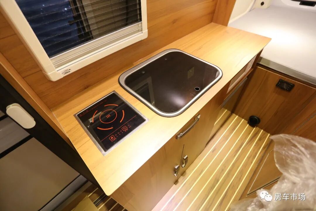 车内厨房操作台的面积为1470×440毫米,使用时能放下不少物品,配有电磁炉、洗菜盆、微波炉、50L车载冰箱,内侧有开窗,下部是置物柜。标配食品级水路系统,135L清水箱、60L灰水箱。