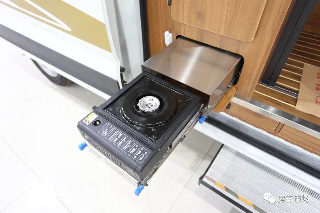 标配有户外多功能抽拉灶台,可使用燃气或者丙烷罐,或者选择户外抽拉式柴油灶(两者可任选其一)。车门打开后电动踏步可联动,并配有防蚊虫纱门,上部配有3米户外遮阳棚、户外照明灯、加水口以及市电接口。
