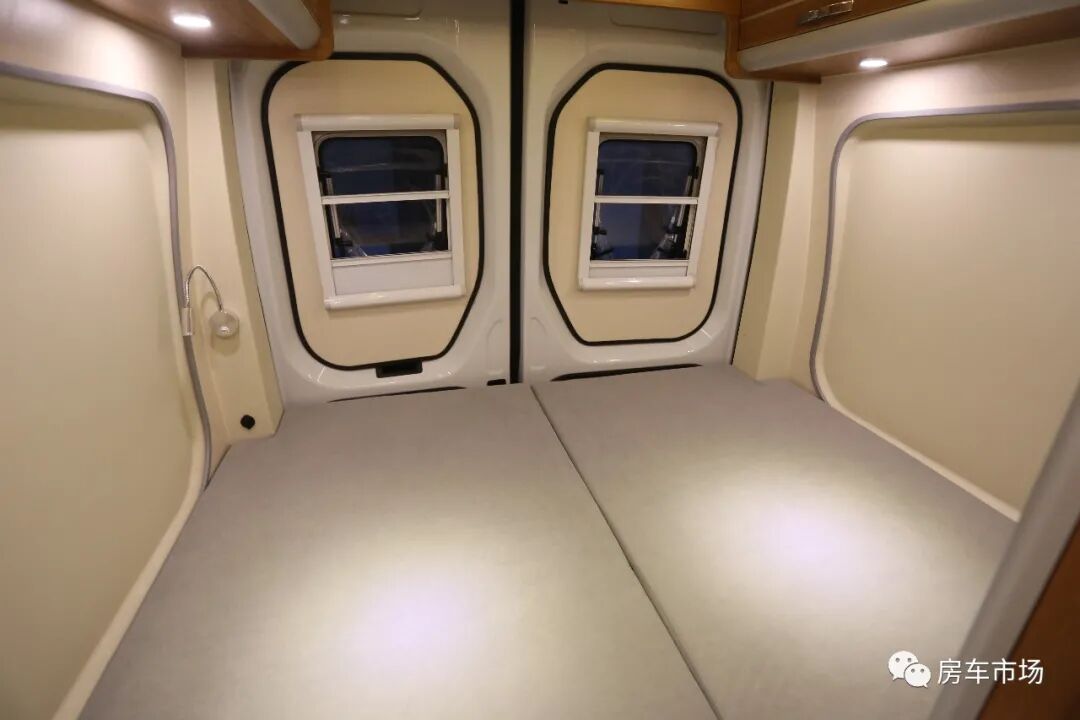 尾部是一张横置大床尺寸:1850×1400毫米,可选二层床,头部配有阅读灯,顶部有12V双向换气扇,四周是吊柜,标配有两扇房车专用外推窗,内侧安装有纱窗以及隐私窗。车内空间照明设施丰富,配有照明灯以及氛围灯。