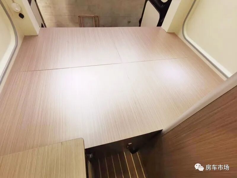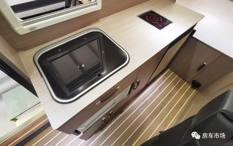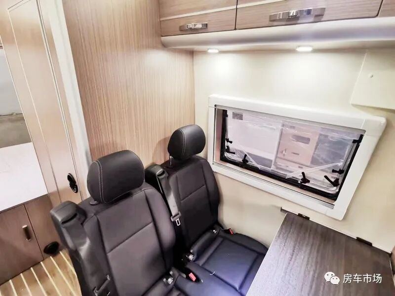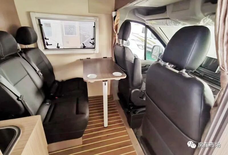 新车内高是1.95米,内部宽是1.85米,可选多种4-6座布局,车内座椅采用2+2结构,整车可荷载4人。座椅用的是奔驰威霆同款座椅,会客区采用双人座椅+移动式餐桌,内侧配有房车专用外推窗,整车标配纱门纱窗,全车通过隔音保温止震处理(包括地板和车门),驾驶舱的上部还配有19寸吸顶电视。会客区的对面是厨卫区,新车还配有户外抽拉式燃气灶,可选装柴油灶。