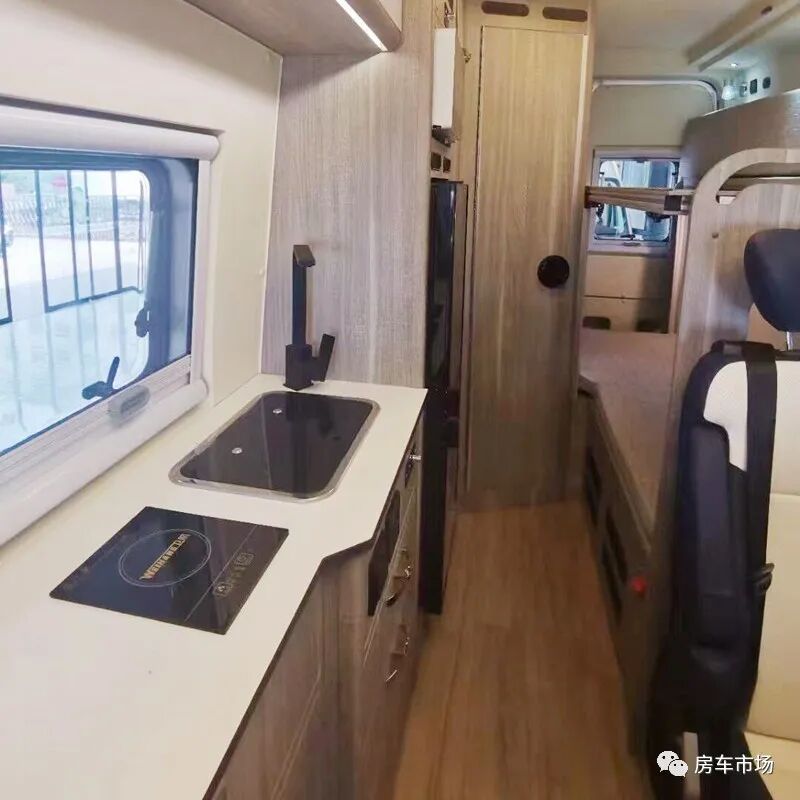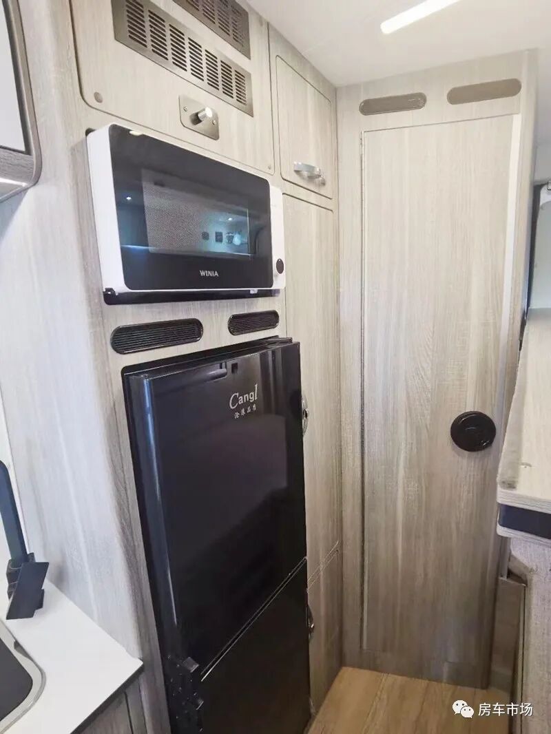 原本中门的位置打造成了整体式橱柜,配有电磁炉、带盖的洗菜池、高弯水龙头、微波炉以及一台12V-133L车载冰箱。在微波炉的上部是该车的后行车空调的出风口。同时在独立卫浴间和橱柜直接还设计有三个衣柜。