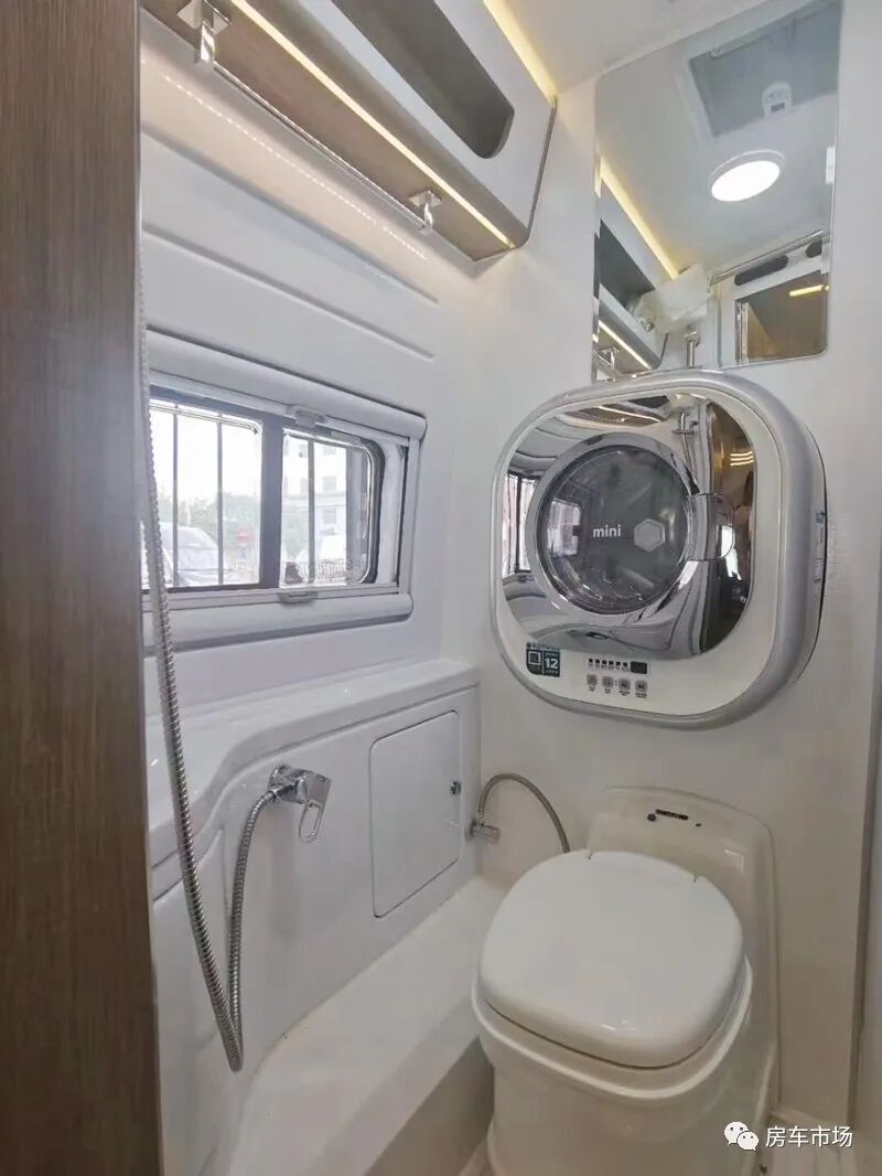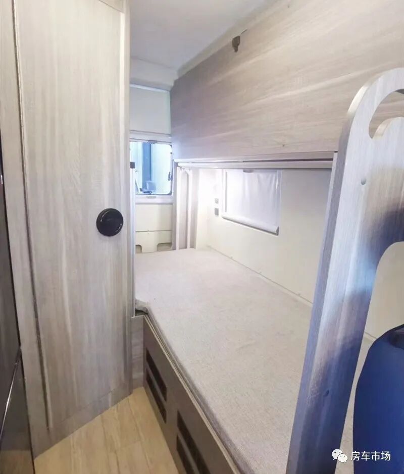 该车采用纵置上下床的结构,上部是一张翻折床,床板可翻转固定。上下两张床位尺寸是1950*900毫米,可睡下两个成年人。车内设计有独立的卫浴间,配有进口盒式马桶(带17L黑水)、可选装车载洗衣机、淋浴花洒、车窗、化妆镜以及换气扇。水电方面,该车配有12v-3000W逆变器、12V-800ah锂电池、150L净水箱以及60L灰水箱。这款无中门的大通房车,空间利用率更高,隐私保护更好,丰富的生活设施为旅行提供保障。