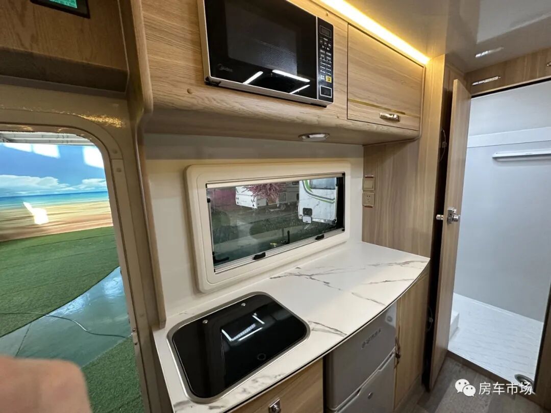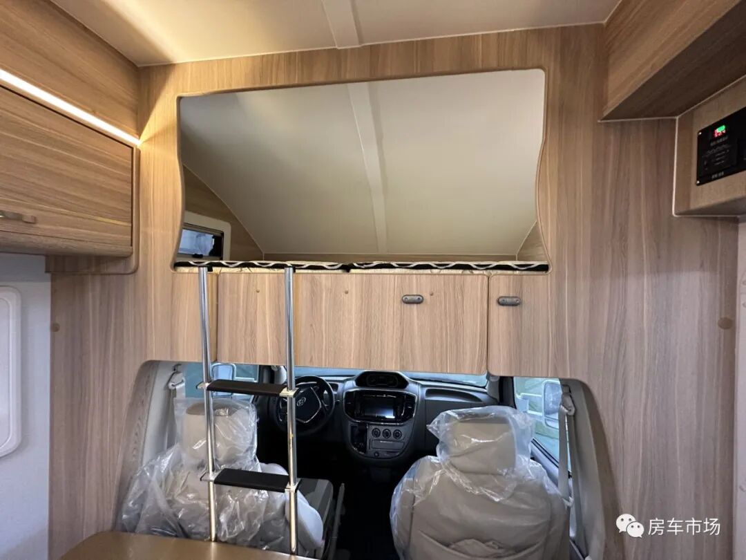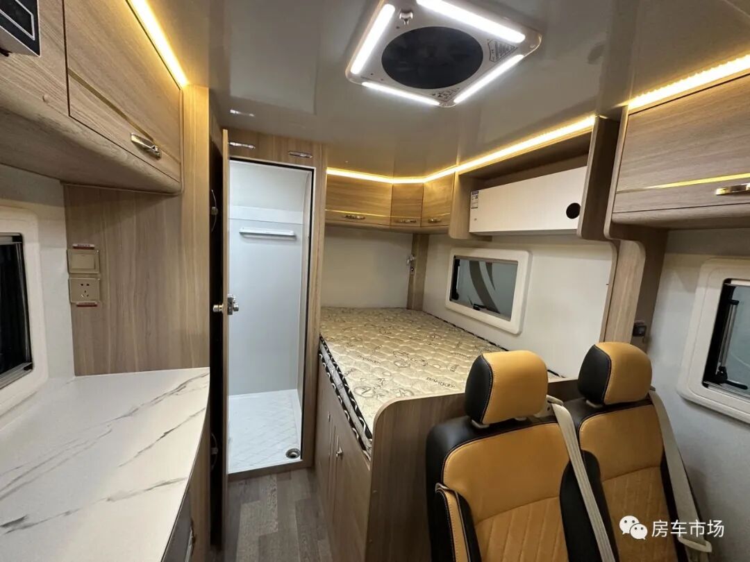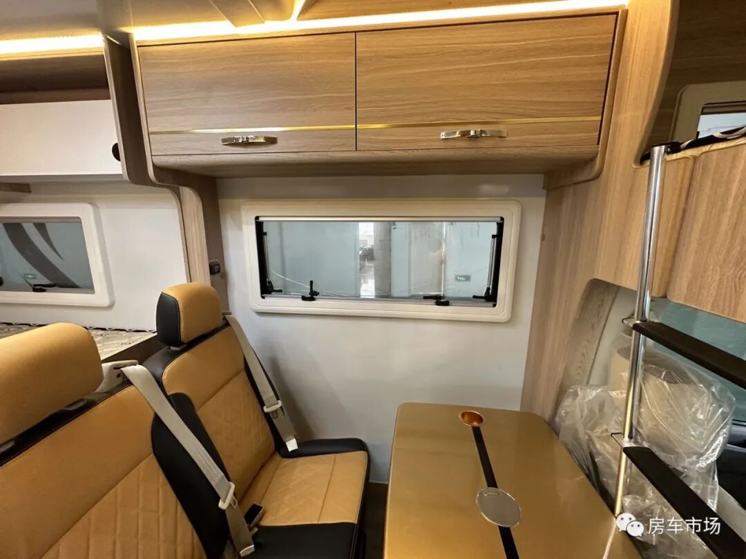 全车采用轻质环保家具板材,E0级别标准,无异味。后纵置床布局,前部为座椅和升降桌板,侧面是厨房,后部是卫生间,经典布局。