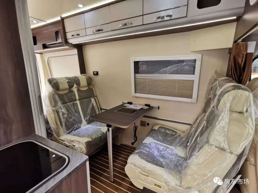驾驶舱后部是该车的会客区,会客区的座椅设计为对卡座,配有移动式餐桌,内侧安装有双层防紫外线的外推窗,内侧加装有纱窗以及隔光帘,上部配有吊柜。冷暖系统方面,新车配有一台12V底置静音分体空调以及5000W独立燃油暖风系统。
