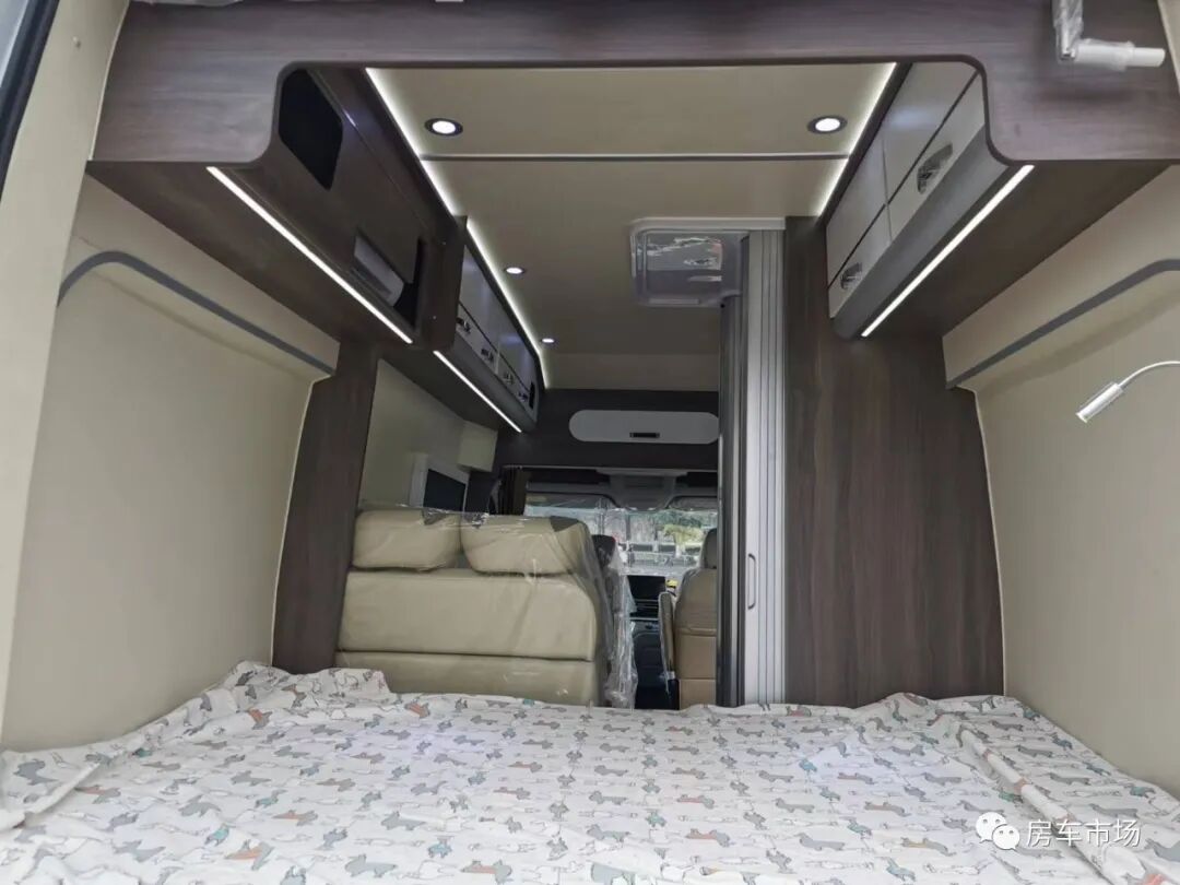 休息的大床的尺寸是1870*1300毫米,横床下部设计为大空间的储物仓。纵置子母床的下床尺寸是:1900*1200毫米,上床尺寸是1900*900毫米。值得一提的是纵床布局让车内空间更加通透。