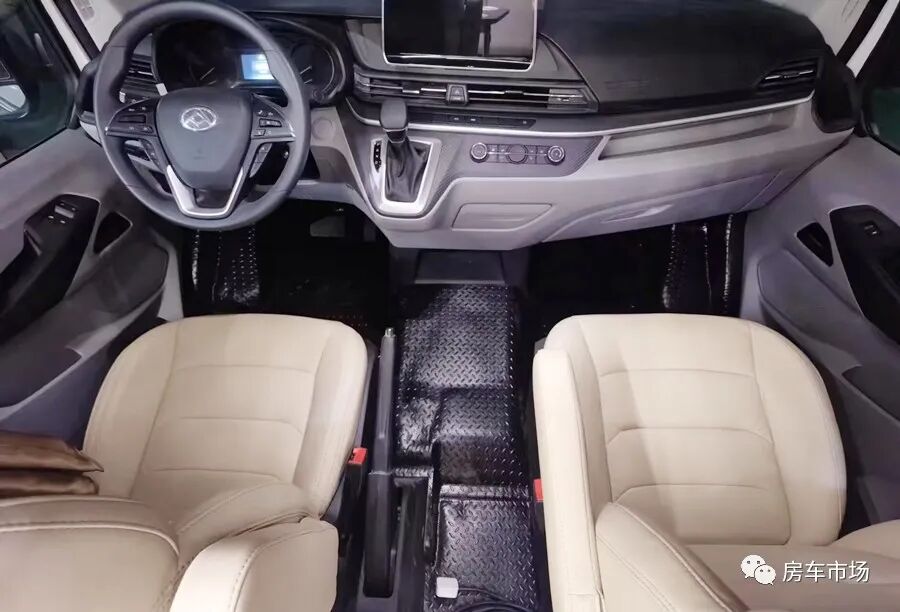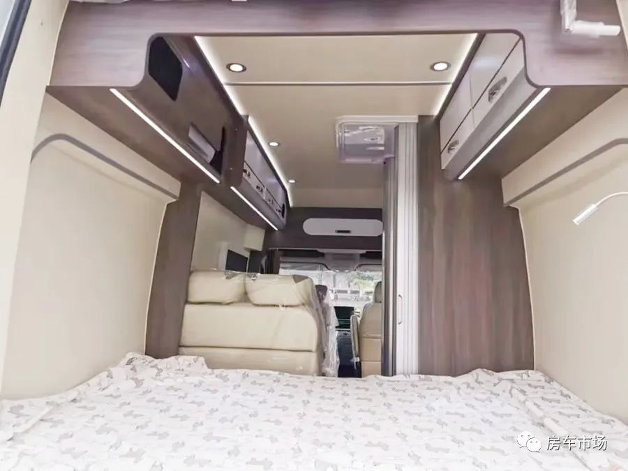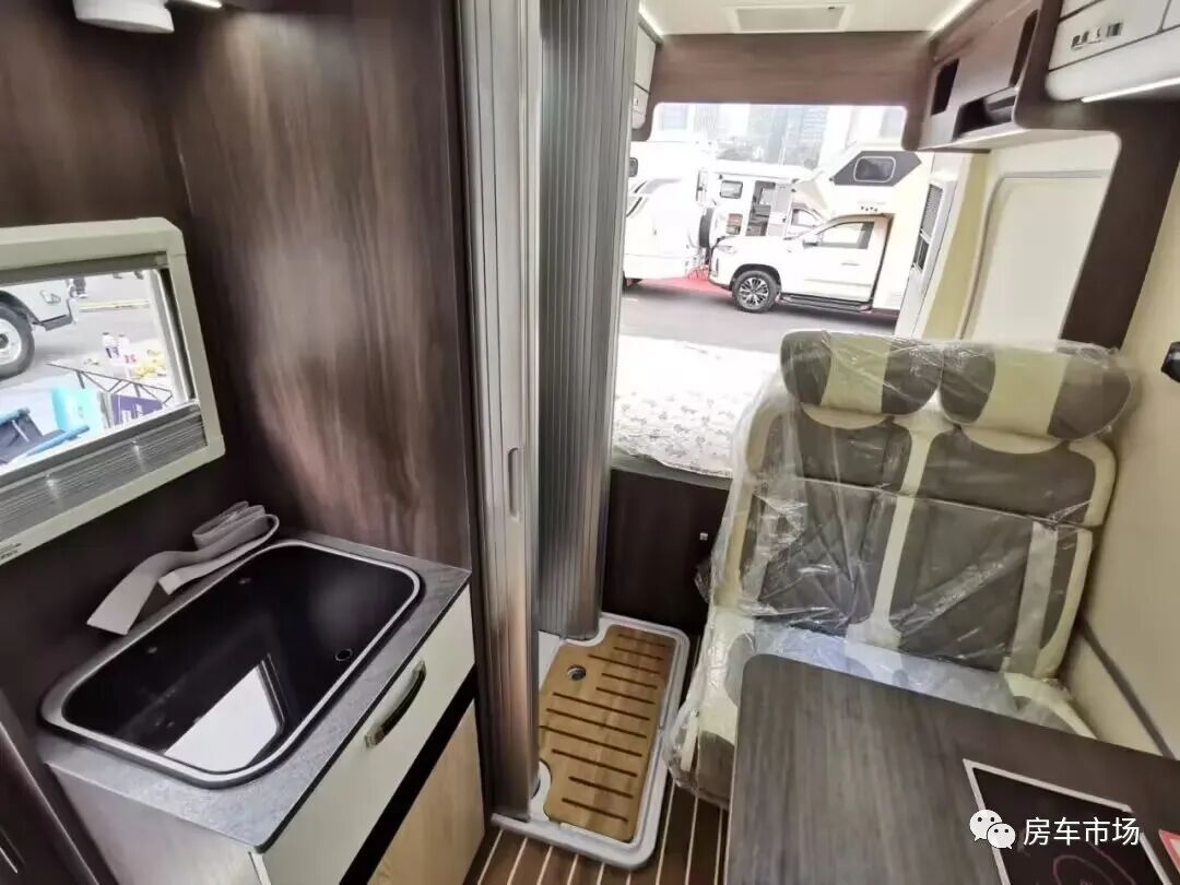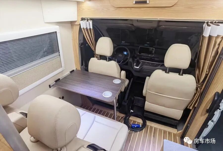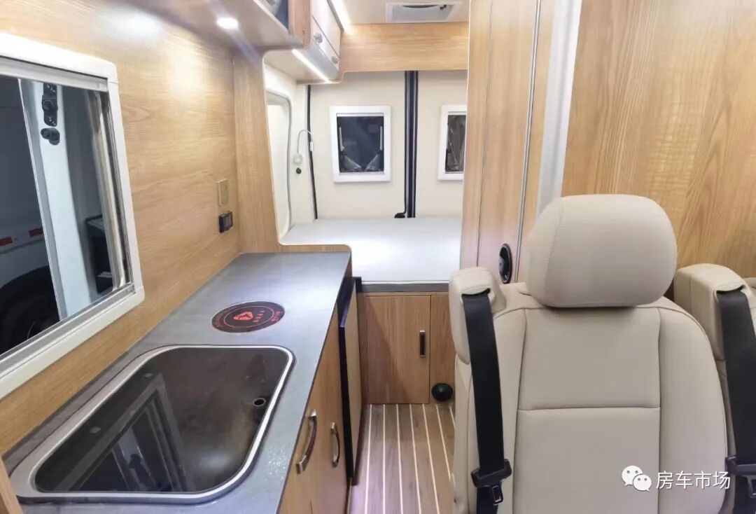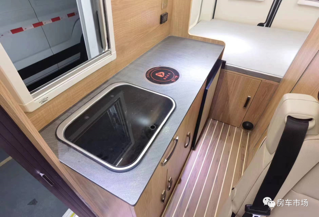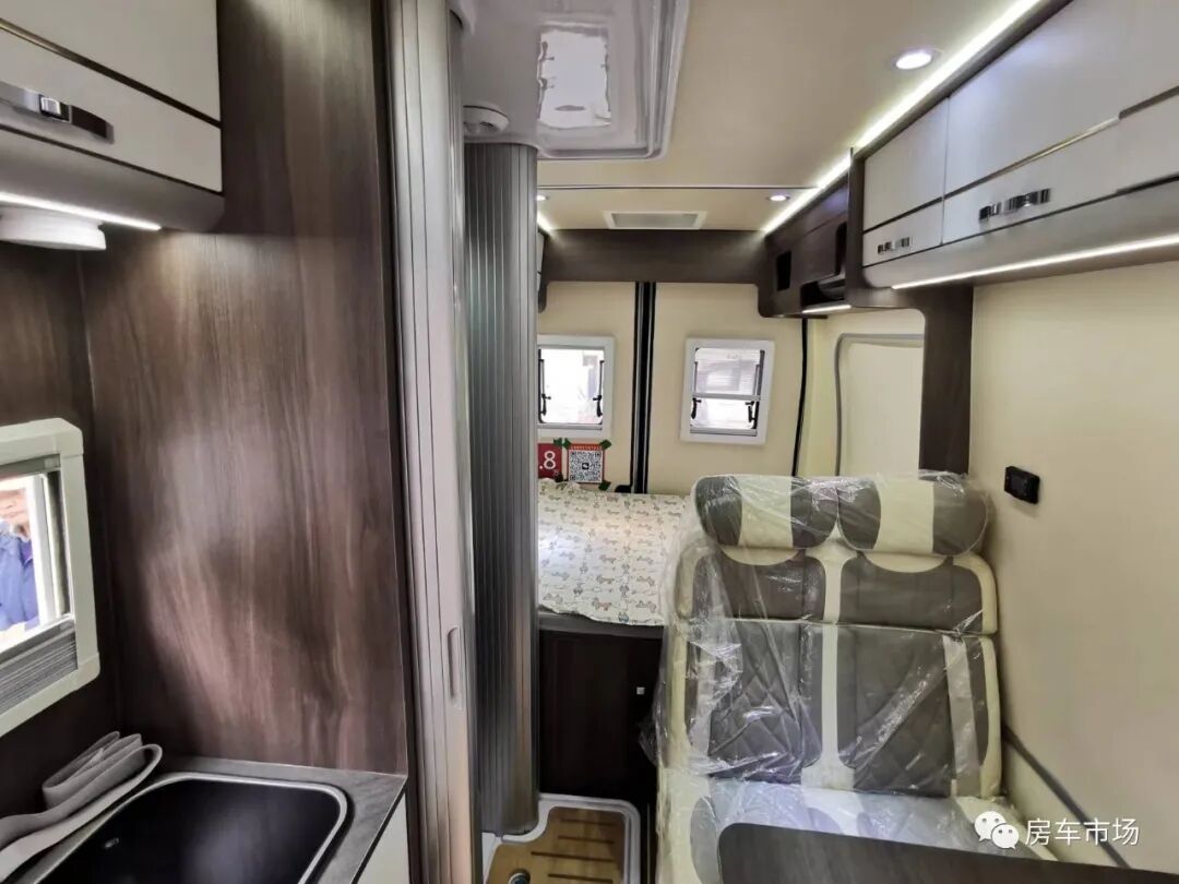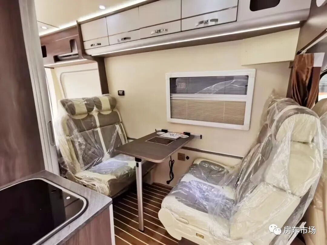 配有移动式餐桌,内侧安装有双层防紫外线的外推窗,内侧加装有纱窗以及隔光帘,上部配有吊柜。冷暖系统方面,新车配有一台12V底置静音分体空调以及5000W独立燃油暖风系统。横床两侧增加盲窗之后的尾床尺寸可达1870*1300毫米,横床下部设计为大空间的储物仓。且整车通过隔音保温止震的处理,保障车内环境安静舒适。会客区对面设计有多功能橱柜,配有带盖洗菜池、电磁炉、12V-70L车载冰箱等。水电配置:清水箱130升,灰水箱60升,400胶体电池,3000瓦充逆变一体机。