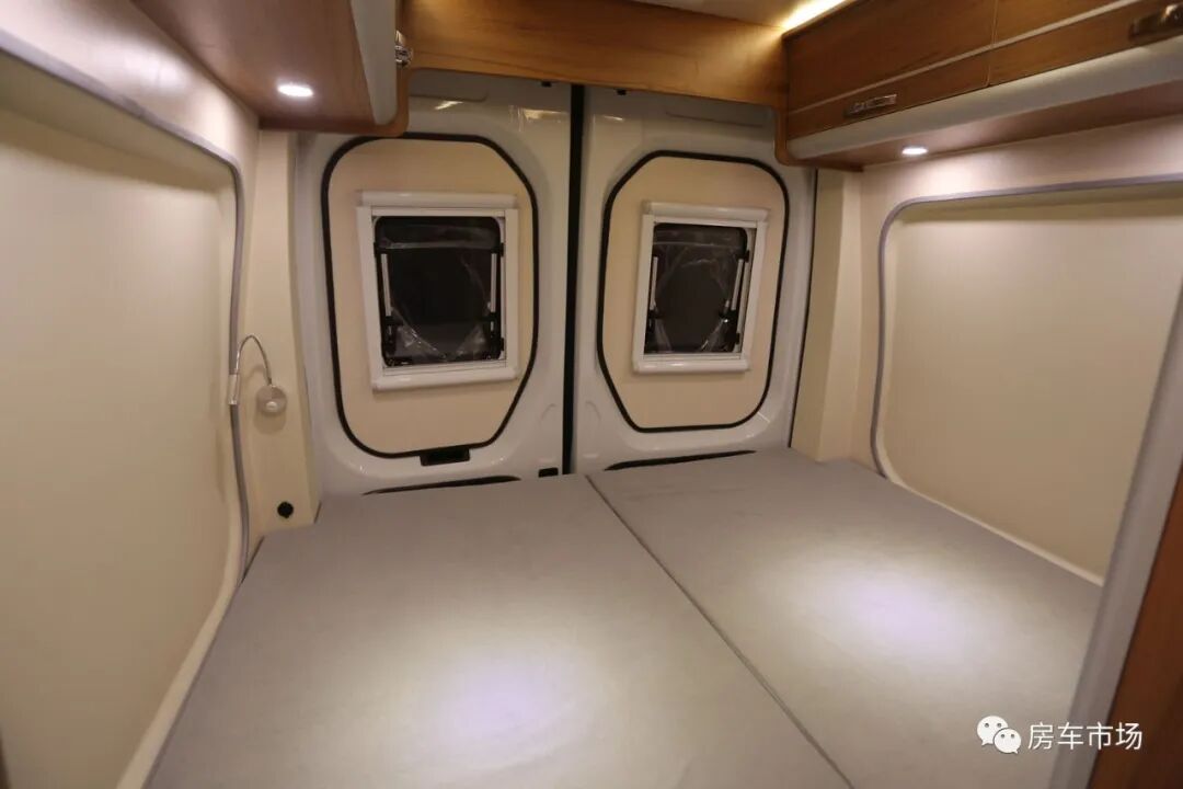 车尾一张横置双人大床尺寸为1.85×1.4米,睡下夫妻俩完全没问题!两侧有吊柜,顶部有12V换气扇,尾门可对侧打开换气,休息看景都方便,尾门还配了外推窗,可透气采光。