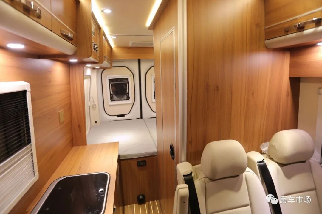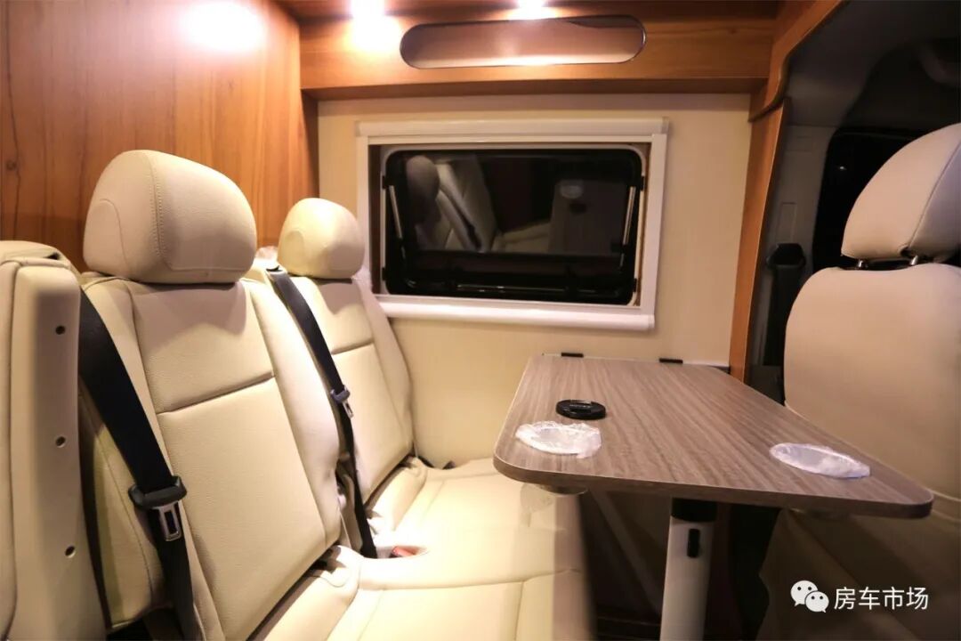 车内4座2卧布局,有独立卫浴间、会客区、固定双人大床、内厨房设计完善,适合夫妻旅行。采用奔驰威霆同款座椅,副驾驶座椅可旋转,标配安全带,可放儿童座椅,内侧配房车专用外推窗,加装隐私窗和纱窗。