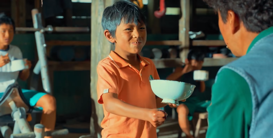 而在片场,午餐时间,孩子们看着碗里大块大块的肉,舍不得打算留在最后吃。