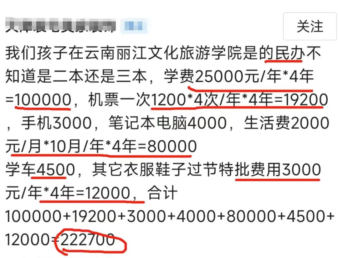 还有一位家长,晒出了自己孩子在云南上大学的花费,4年大概算下来是222700元。