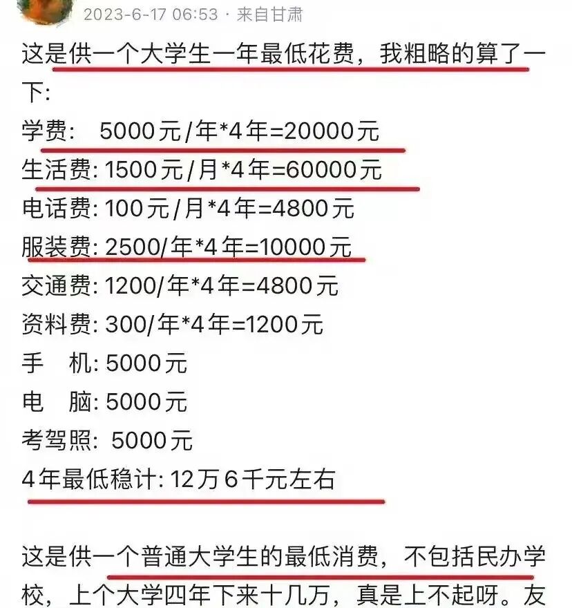 有一位甘肃妈妈公布了自己孩子大学四年最低花费,感叹:“真供不起孩子上大学了!”