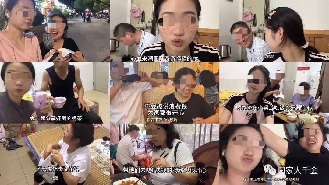 女孩带爸爸妈妈出门吃大餐,爸爸还会拍照纪念;