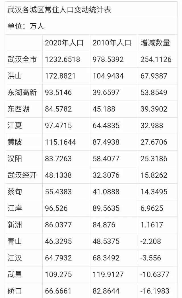 根据武汉第七次人口普查数据来看,汉口三区整体人口减少,其中硚口区和江汉区较2010年分别减少了16.1万、3.5万,只有江岸增加了6万多。