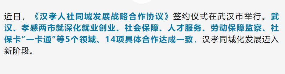 今年开始,汉孝一体化持续发力,武汉地铁将延长到孝感、两地开通武孝城际公交,最近武汉和孝感还签订了一个《汉孝人社同城发展战略合作协议》,在就业创业、社会保障、人才服务、劳动保障监察、社保卡“一卡通”等具体项目合作上达成一致,推动汉孝一体化进一步发展。