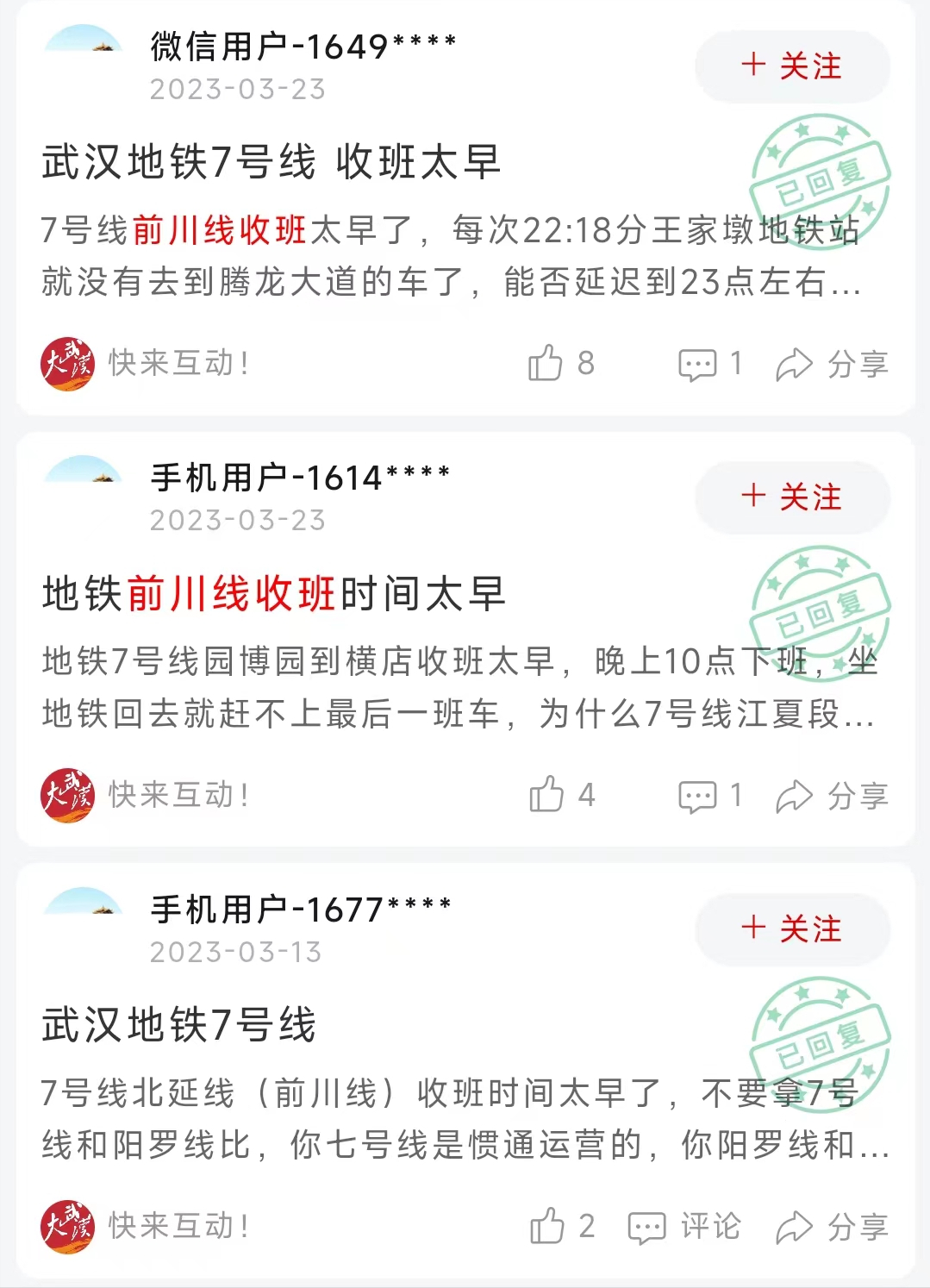 最近看武汉城市留言版,发现不少市民朋友关注7号线北延线(以下简称前川线)一期收班早的问题。