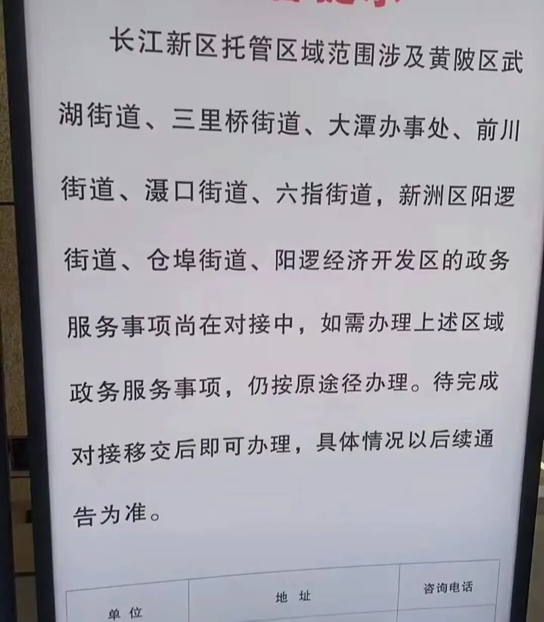 简单的理解就是,虽然现在长江新区政务中心在武湖开业了,但是目前只托管了谌家矶,只有谌家矶的可以来这个政务中心办事,武湖、三里桥、六指等其他地方办事还是去黄陂办,阳逻、仓埠的办理相关业务还是去阳逻或者新洲办。