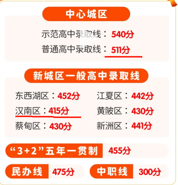 这样一来,武汉郊区竞争压力就没有市区大,加上有些郊区本身高中数量多,普高线自然比市区低很多。