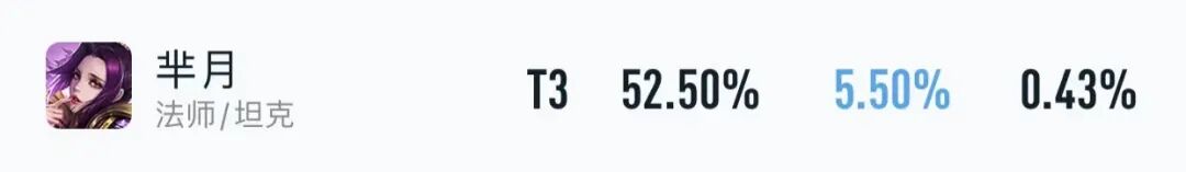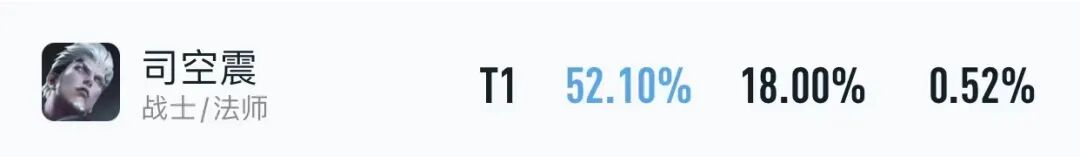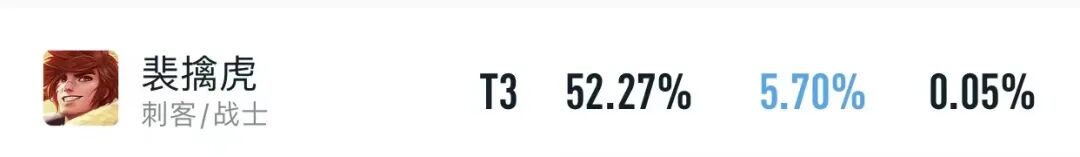 不过,由于裴擒虎对意识的要求太高了,使得他虽然拥有52.27%的胜率,但出场率却一直提不上去,所以,我仅把他排在T1下游,跟露娜一样,都属于“真爱党”的冲分利器。