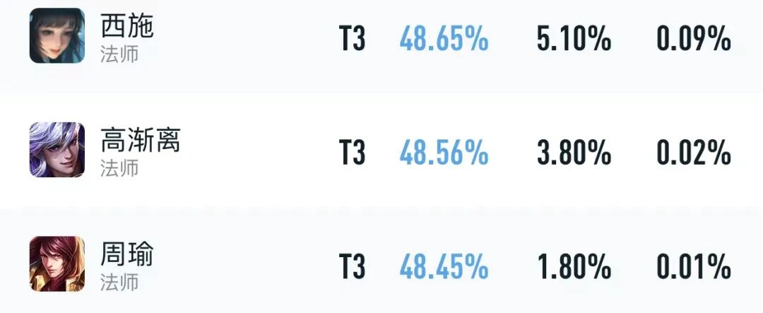 第三点,备受期待的高渐离,西施和周瑜,并没有因为装备的改动而起飞,甚至优先级还变低了一点,特别是周瑜,仅有1.8%的出场率,排在了垫底位置。