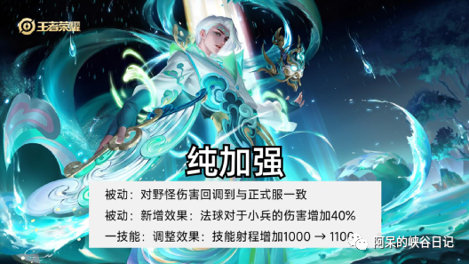 然后被动新增效果,法球对小兵的伤害会增加40%,相比之前的调整,下调了10%。然后一技能的技能射程同样还是增加100码。