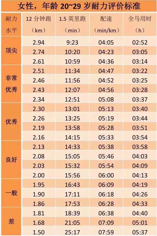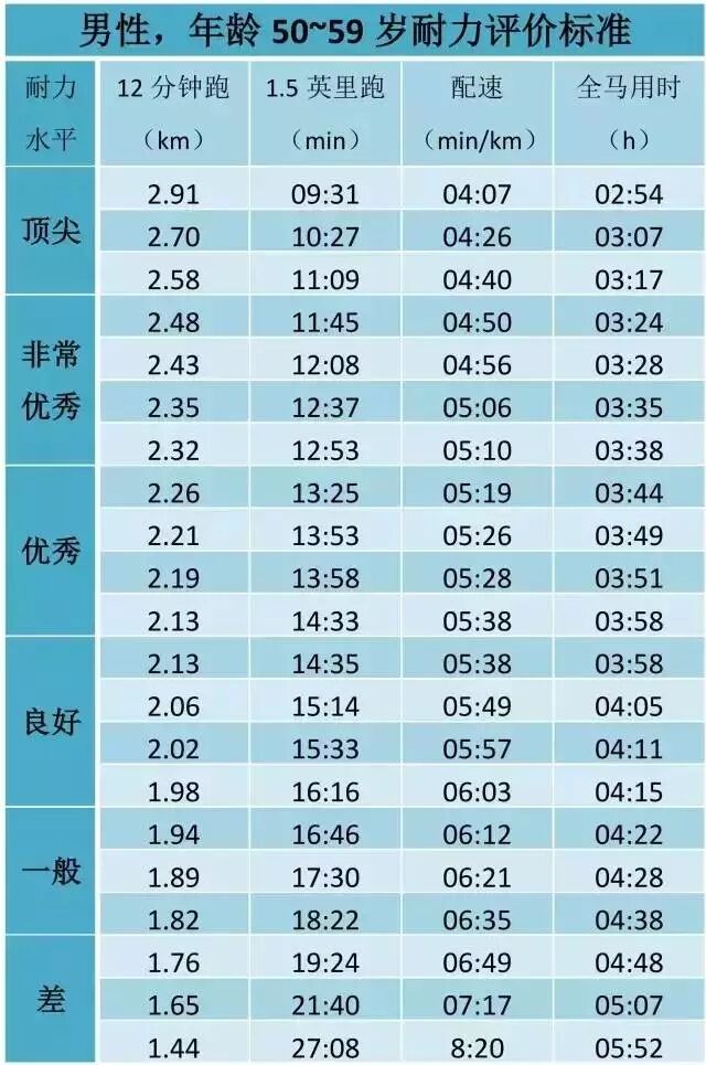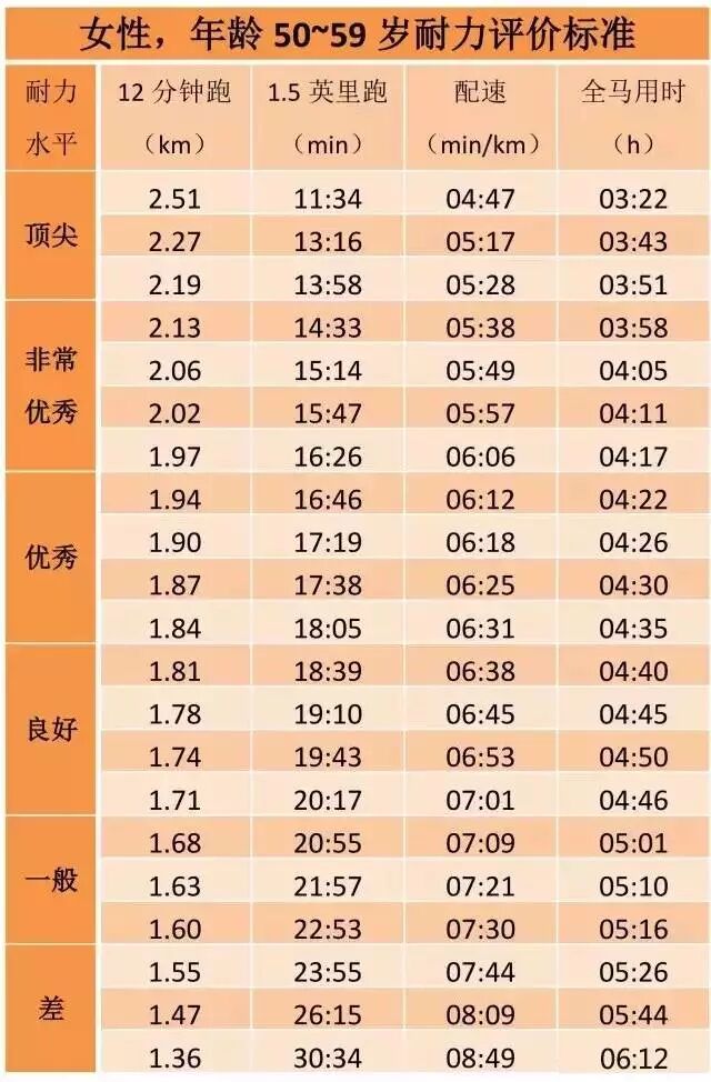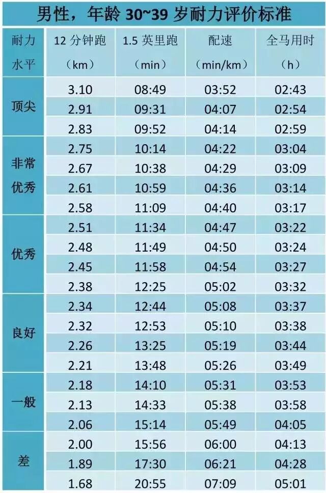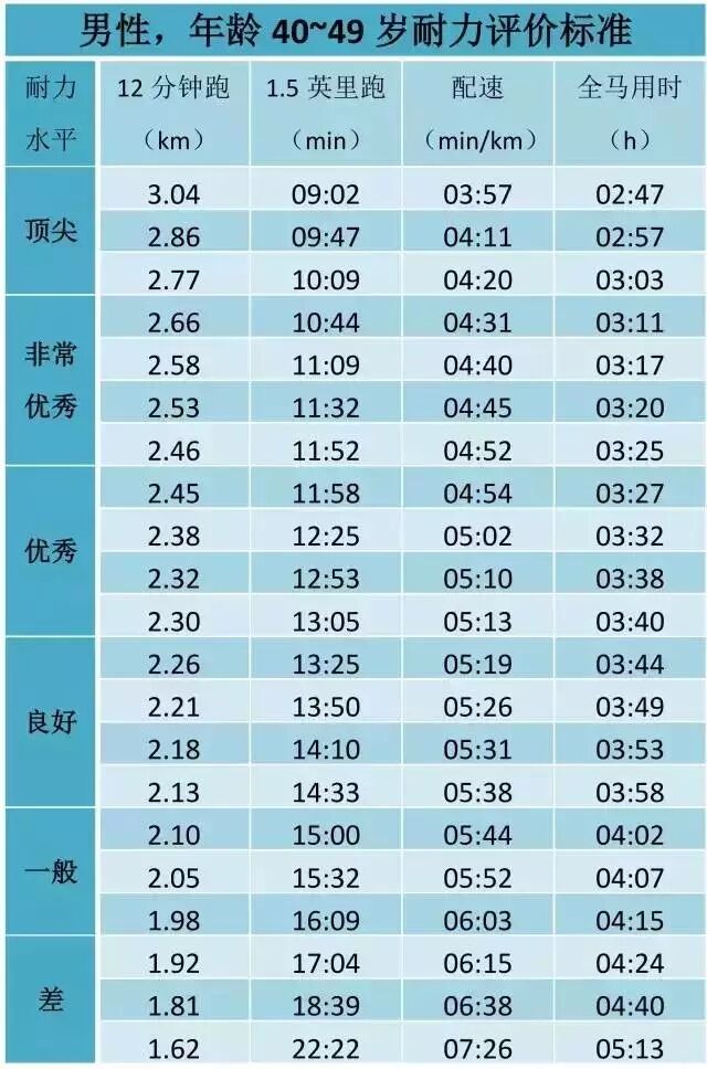 注:国际耐力标准,与大多中国人相比可能偏高。参考上表比照自身时,可允许略微降低相关数据的标准。