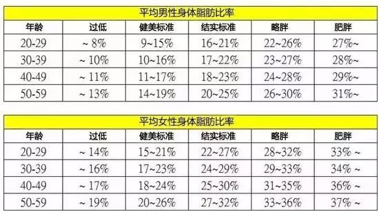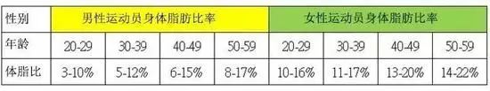下面的表格“年龄与脂肪比”,你可以按照里头的脂肪比去进行体重与身材的评估。通过饮食及训练,跑者们可以期待体重或脂肪量的下降。