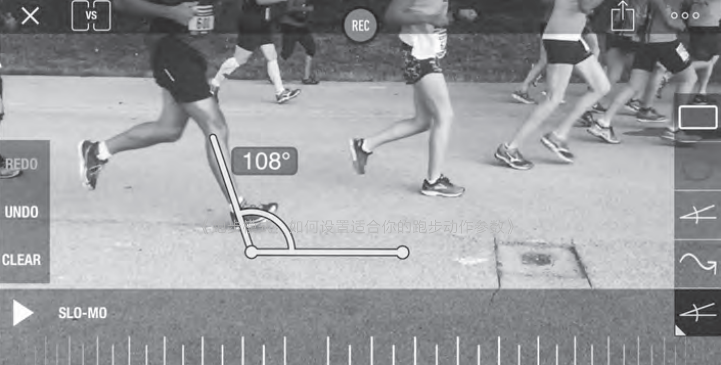 从拍摄的第一个慢速跑视频开始,使用视频应用程序打开视频,一帧一帧地播放,直到找到一条腿向前摆动到最大幅度(右腿或左腿均可)的画面。