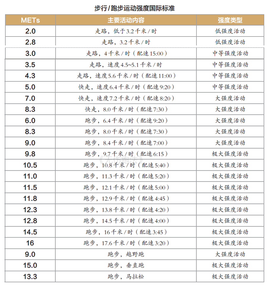 从下表中可以看到,普通步行(4~6 千米/时)都属于中等强度活动,快走(7.2 千米/时)已经是大强度活动。而只要是双脚离地的跑步,无论速度快慢,都属于大强度活动。跑得越快,强度越大,MET值越高。