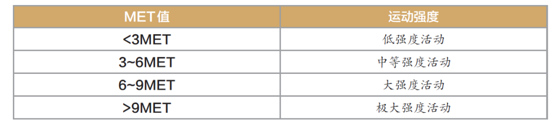 先给大家科普一个评价强度的关键指标——梅脱(MET)。梅脱又称能量代谢当量,它是指运动时摄氧量与安静时摄氧量的比值。MET是评价绝对运动强度的标准指标。不同MET 值代表不同运动强度。