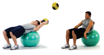 仰卧在稳定球上,屈膝90度,双脚平放于地面,双臂伸直,持药球举过头顶