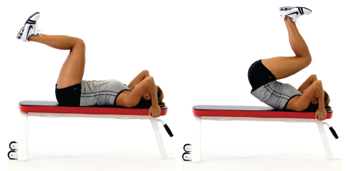 髋部抬离长椅,将膝关节靠向胸部后,缓慢降低髋部
