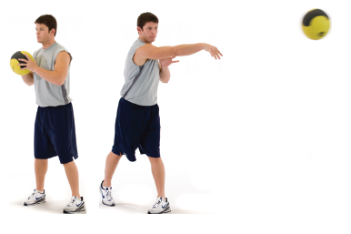 迅速向前卷腹,将药球投掷向墙壁,药球出手后双臂继续挥动至最大限度