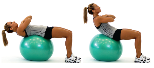 仰卧在稳定球上,屈膝90度,双脚与肩同宽,双臂交叉放于胸前
