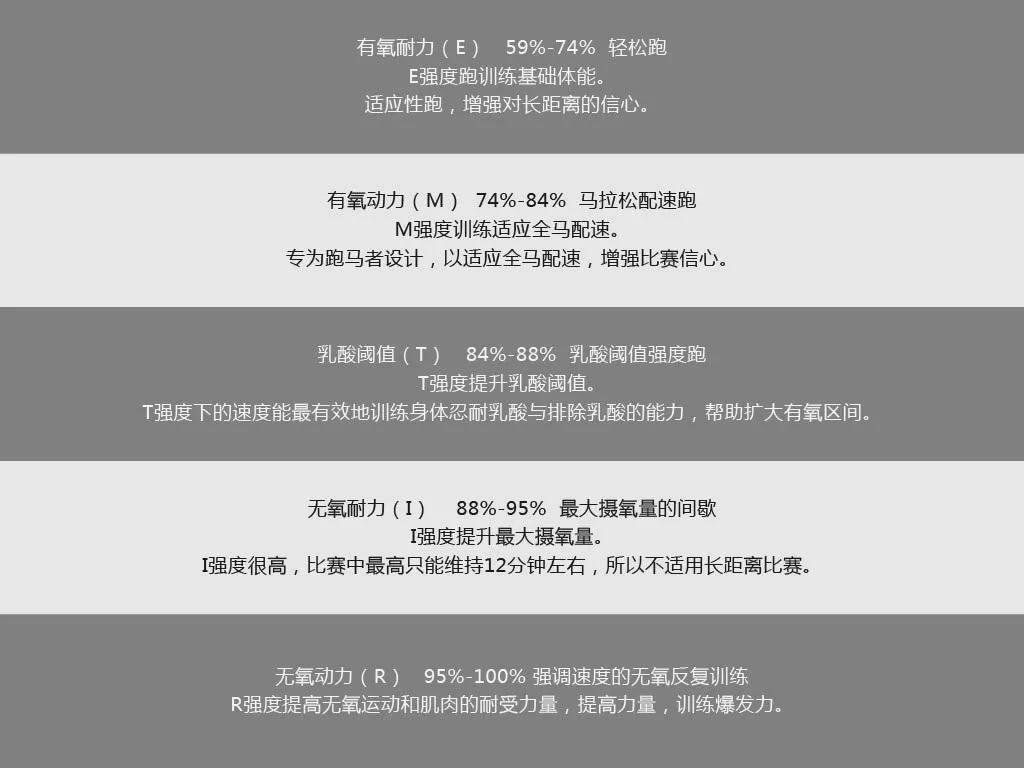 按照HRR方法确定目标强度心率,可把运动强度划分为E/M/T/I/R共计5种。强度(%HRR)