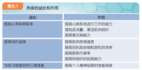 好处:提高心率和呼吸率、提高组织温度、为练习做更好的心理准备。