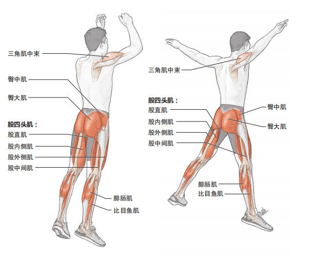 3.落地时,尽量伸直膝关节,以确保足中部接触地面并保持较高的身体姿态。