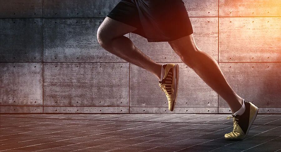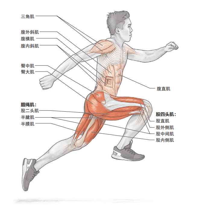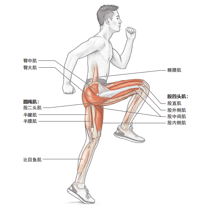 双脚并拢。单侧膝关节向前,同时伸出对侧手臂。此时对侧腿便可在拉长的步幅中进行有力伸展。