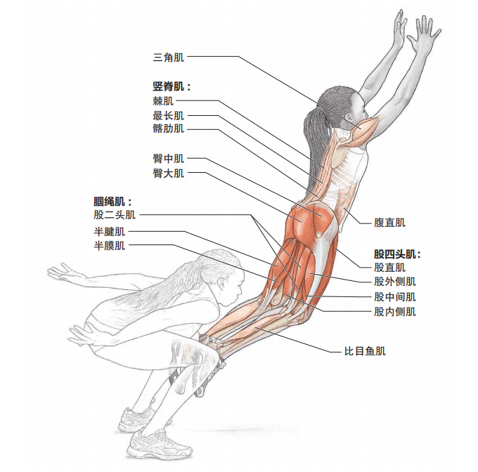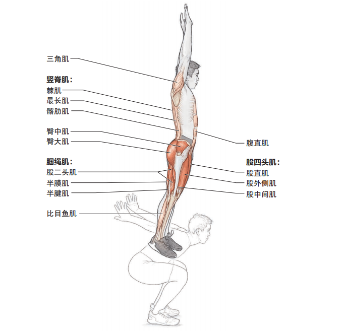 用力向前摆臂,与此同时伸展髋关节,再向上跳,背挺直。目的是跳到最大高度。微屈髋关节、膝关节和踝关节以准备落地。