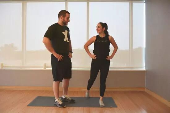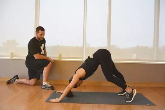 跑者先弯腰,双手双脚都接触到地面,背部向上拱起,身体呈倒V字形。然后将右脚跟完全接触到地面,坚持几秒钟之后恢复原始姿势,再换左脚跟着地。如此重复5次。