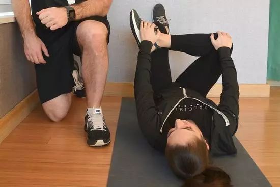 跑者平躺在地面,双腿伸展开。然后抬起左腿,将双手扣在左腿的膝盖后方,用力将左腿将头部方向移动,必须保持左腿伸直。重复做5次后换右腿做同样的动作。