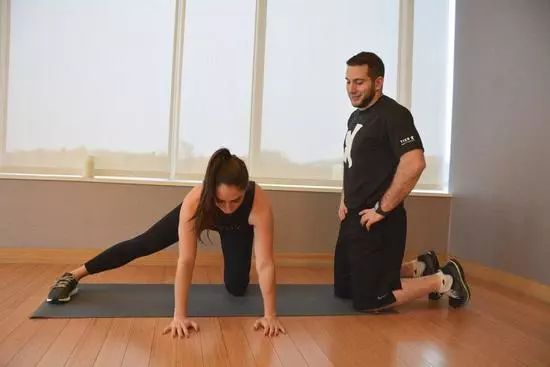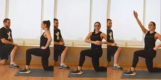 摆出半跪的姿势,右膝盖着地,左膝盖弯曲成90°。上身保持直立,右腿臀部肌肉收紧,双手放在左膝盖上,身体前倾,让左膝盖朝脚趾方向靠近。