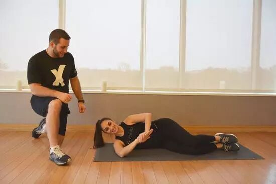 侧躺在地面上,先以身体右侧着地,右臂向外伸直与身体垂直。将左肩膀向后方滚动。然后将右手朝向面部,手肘弯曲成90°。