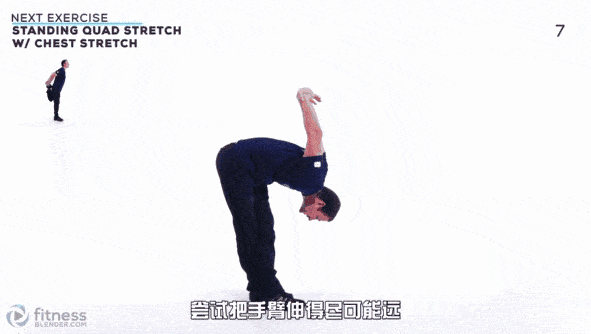 双手从背后抓住腿,然后向后尽可能的伸展,同时一定要抬头挺胸;拉伸大腿前侧、胸肌、以及脖子。
