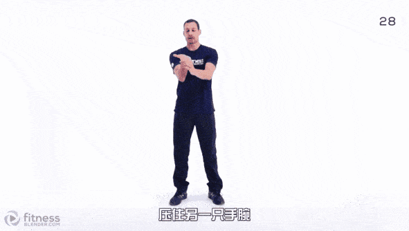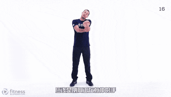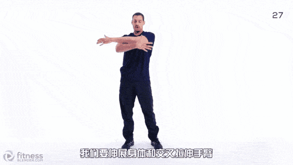 双脚与肩同宽站直,交叉双手,另一只手抓住手肘向后引导,同时转动上半身使手肘超过胯部;拉伸肩部三角肌后束和背部的肌肉。