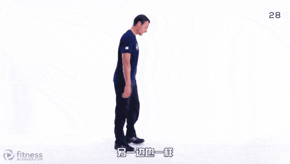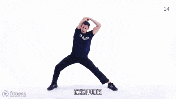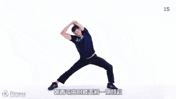 半蹲成箭步,把手背在头后面,另一只手抓住手肘往后拉,身体向伸直的腿倾斜,拉伸肱三头肌、侧边的腰腹肌肉以及大腿内侧。